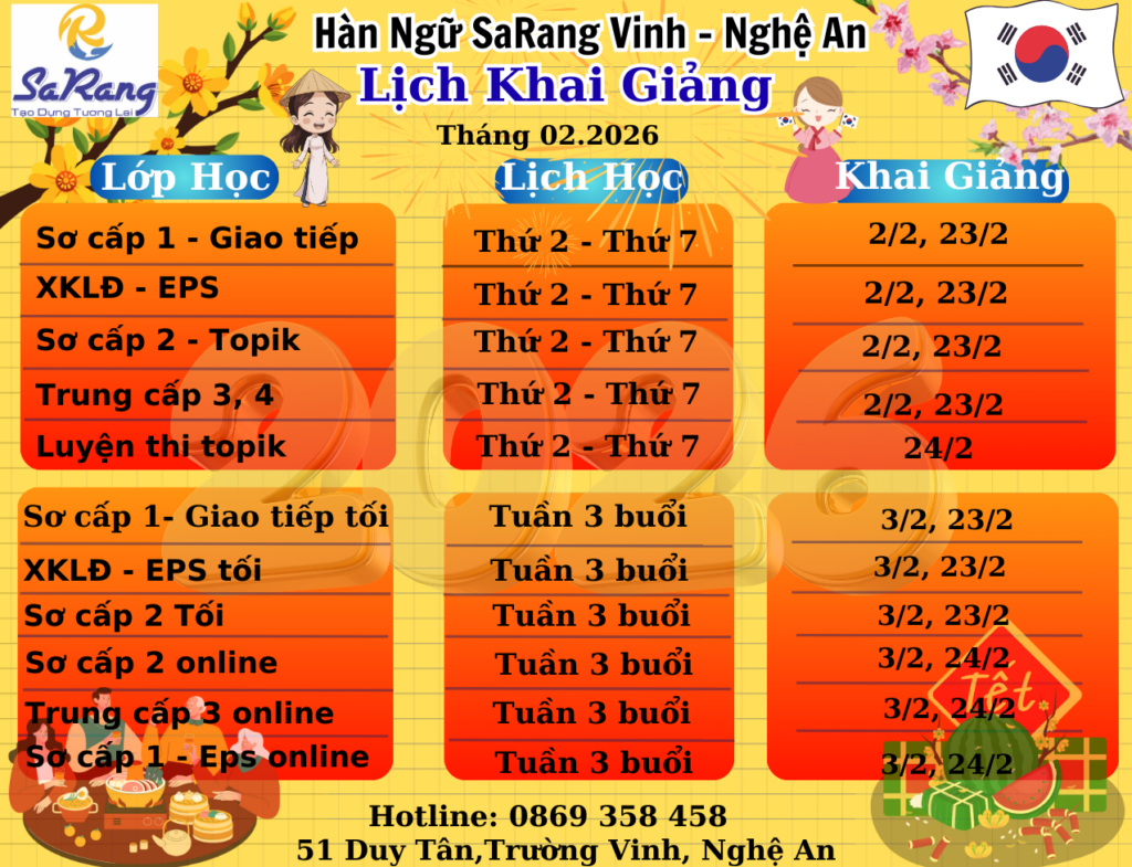 𝑻𝒓𝒖𝒏𝒈 𝒕𝒂̂𝒎 𝑯𝒂̀𝒏 𝑵𝒈𝒖̛̃ 𝑺𝒂𝑹𝒂𝒏𝒈 𝑽𝒊𝒏𝒉 – 𝑵𝒈𝒉𝒆̣̂ 𝑨𝒏 khai giảng các lớp tiếng Hàn 𝒃𝒖𝒐̂̉𝒊 𝒏𝒈𝒂̀𝒚, 𝒃𝒖𝒐̂̉𝒊 𝒕𝒐̂́𝒊, 𝒐𝒏𝒍𝒊𝒏𝒆 𝒗𝒂̀ 𝒐𝒇𝒇𝒍𝒊𝒏𝒆 vào tháng 𝟎𝟐/𝟐𝟎𝟐𝟔 có các lớp: